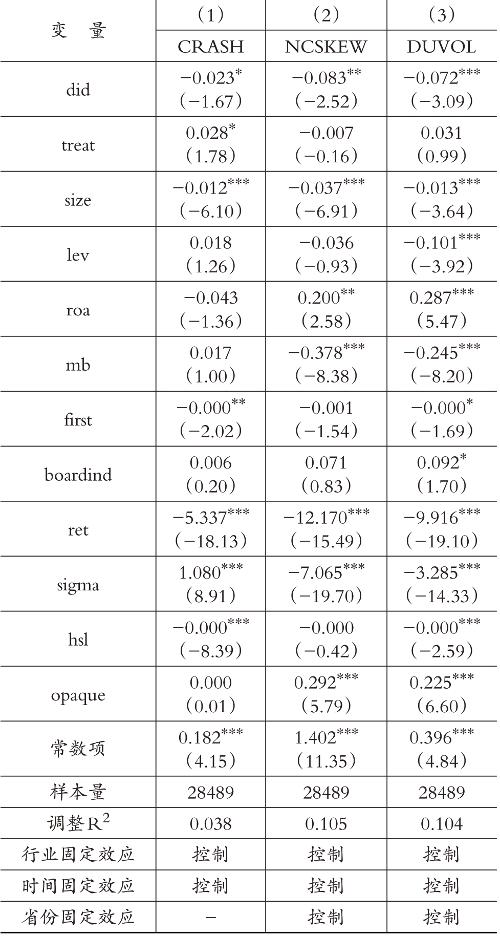 注:括号内为经个体聚类调整后的t值。*、**、***代表在10%、5%和1%的水平上显著。下同。