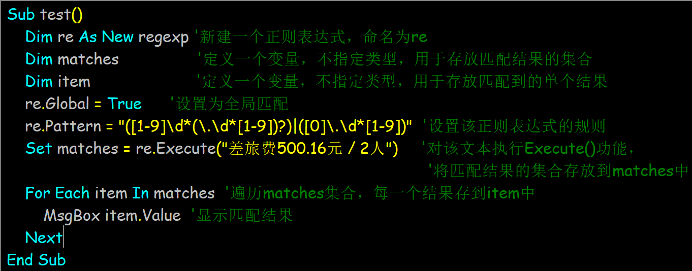 接下来,便可以在代码中定义一个正则表达式,设置好Global和Pattern属性,依照Pattern中存储的规则,利用Execute(源文本)功能去匹配整个文本。示例代码和结果如下: