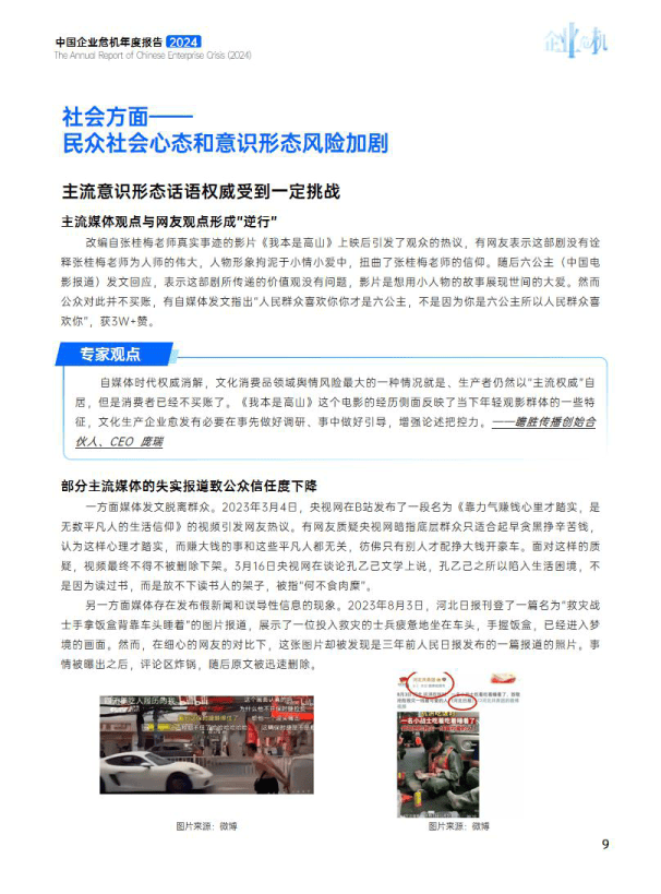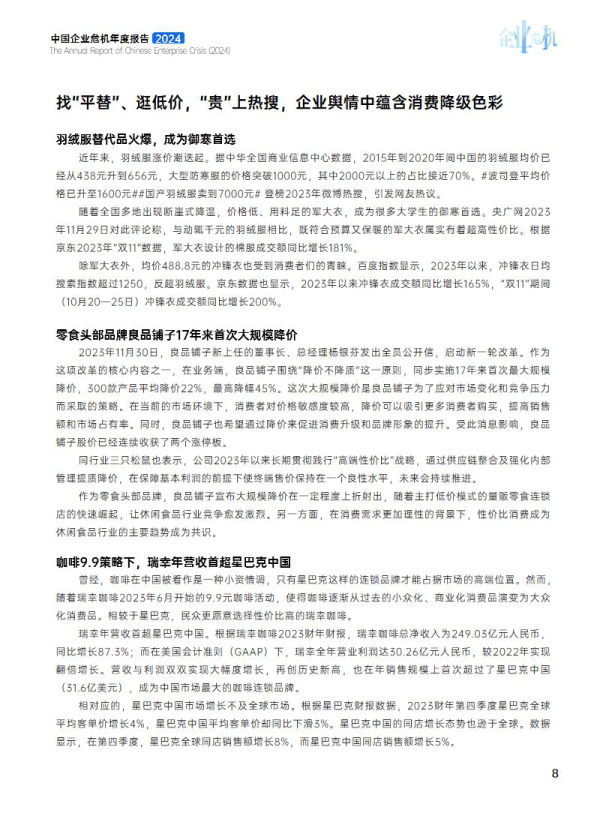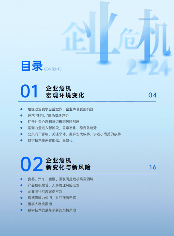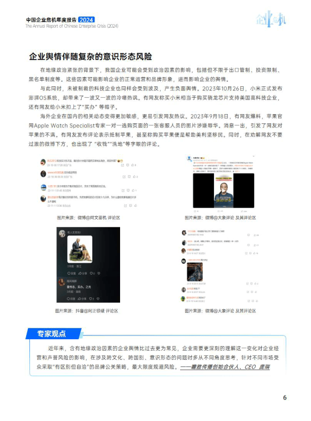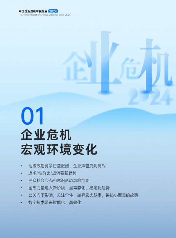 企业危机的产生往往源于多种因素。从宏观层面看,《报告》指出,2023年,地缘政治的复杂局势对中国企业尤其是已出海或准备出海的企业有着深远的影响;而国内方面,“性价比”的消费观念也催生了新的企业危机。“平替”产品受到追捧,低价商品和国货成为“网红”,但品牌“红了”不等于“稳了”,忽视质量将可能陷入新的舆情危机。
