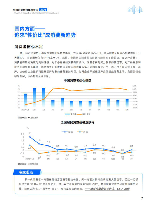 由于经济形势的不确定性增加和疫情的影响,2023年消费者信心不足。全年前11个月信心指数均低于分界线100,同比增长仅有4个月高于0%,此外,全国居民消费价格同比持续呈现下降趋势。在这种背景下,消费者在购物决策时更加谨慎,对非必需品的消费有所减少。消费者在购买力受限的情况下,对产品品质和服务的期望并未降低。消费者更可能根据自身需求和预算选择不同的品牌或产品,而不是长期忠诚于某一品牌,这使得企业维护和提升品牌形象的任务更加艰巨。如果企业不能保证产品质量或服务水平,负面舆情很容易发酵,从而影响企业形象。