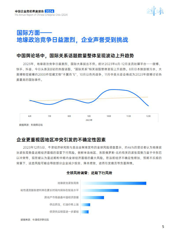 2023年12月5日,牛津经济研究院与走出去智库发布的全球风险调查显示,约46%的受访者认为地缘政治紧张局势是近期经济面临的首要下行风险。朝鲜半岛地区、东欧俄罗斯-北约有关的紧张局势乃至于中东巴以冲突等,现在被认为是近期和中期内全球经济面临的最大风险。在当前经济不确定性增加,预期不乐观的背景下,这些风险可能会导致部分企业减少投资、降本增效,进而引发裁员等负面舆情。