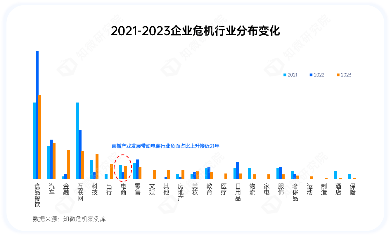 从各行业危机事件数量占比上来看,2023年危机在越来越多的行业中发生,危机行业“泛化”趋势更加明显。食品餐饮、汽车、金融、互联网是危机频发的主要领域,直播的蓬勃发展也促进了电商行业企业危机占比的增长,出行、文娱、物流行业相关的危机事件占比较2022年有明显提升。