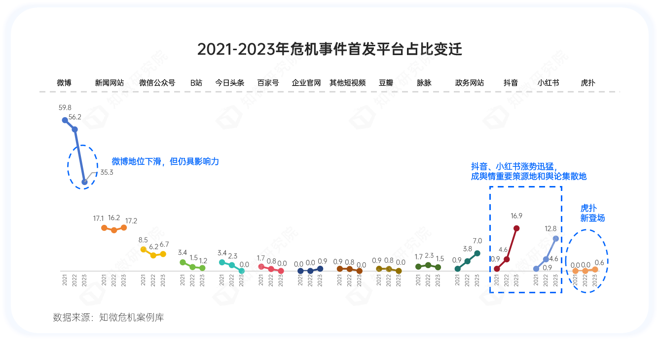 同时,2021-2023年,企业危机首发平台中,微博仍是企业舆情危机的主要爆发地,虽2023年占比有所下降,但仍居各类平台的首位。此外,虎扑成为2023年企业危机新的发源地;抖音和小红书因涨势迅猛,也已成为企业危机和网络舆论的重要集散地。