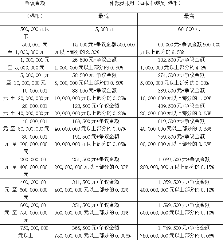 2.收取的仲裁员的报酬和费用为非港币时,仲裁委员会香港仲裁中心按照本费用表的规定收取与港币等值的外币。