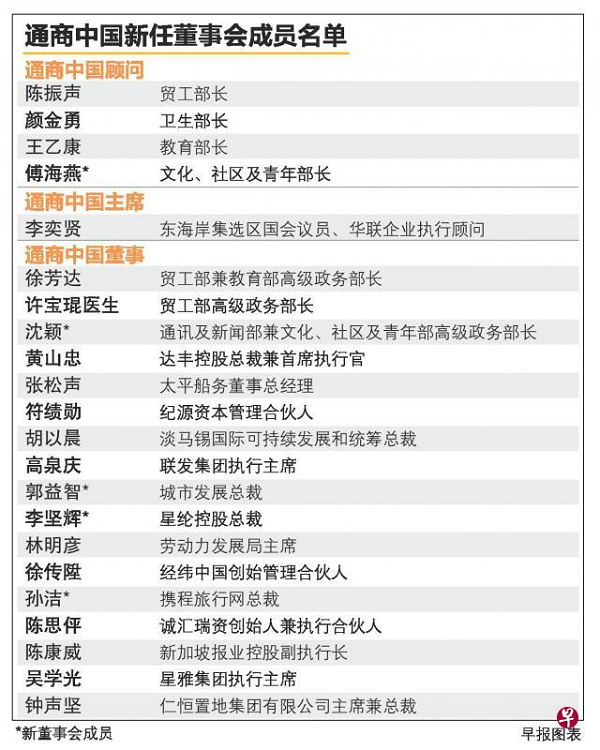通商中国由新加坡已故总理李光耀在2007年倡议设立。包括2017年加入董事会的纪源资本管理合伙人符绩勋和经纬中国创始管理合伙人徐传陞在内,通商中国现有18名董事和四名顾问。李显龙总理继续担任这个非盈利机构的赞助人。