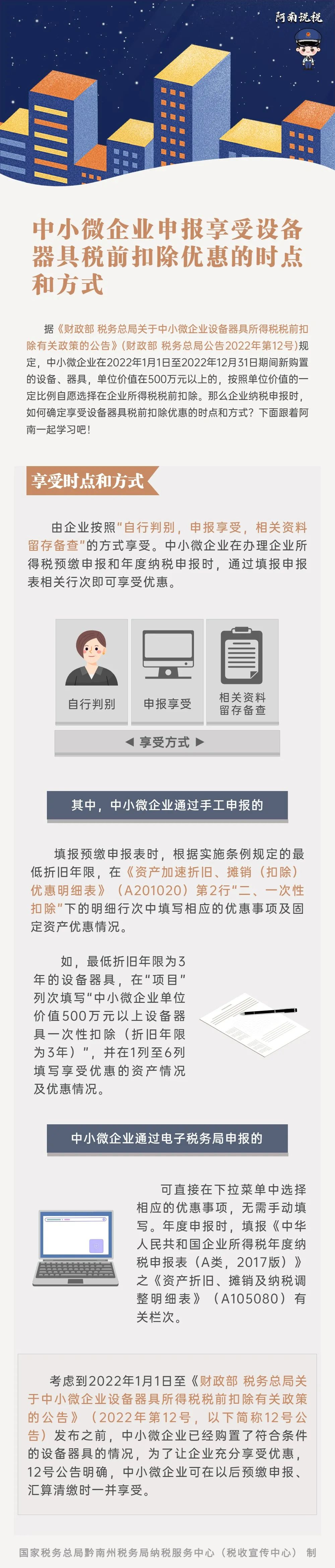| 中小微企业申报享受设备器具税前扣除优惠的时点和方式当前您所在的位置:首页 > 税务 > 财税中心 > 企业所得税