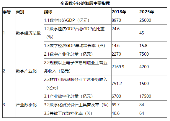 到2025年,数字经济规模进入全国前10强,突破25000亿元,年均复合增长率保持15.8%以上;数字经济占GDP比重达到45%,其中数字产业化总量突破7500亿元,产业数字化总量突破17500亿元。