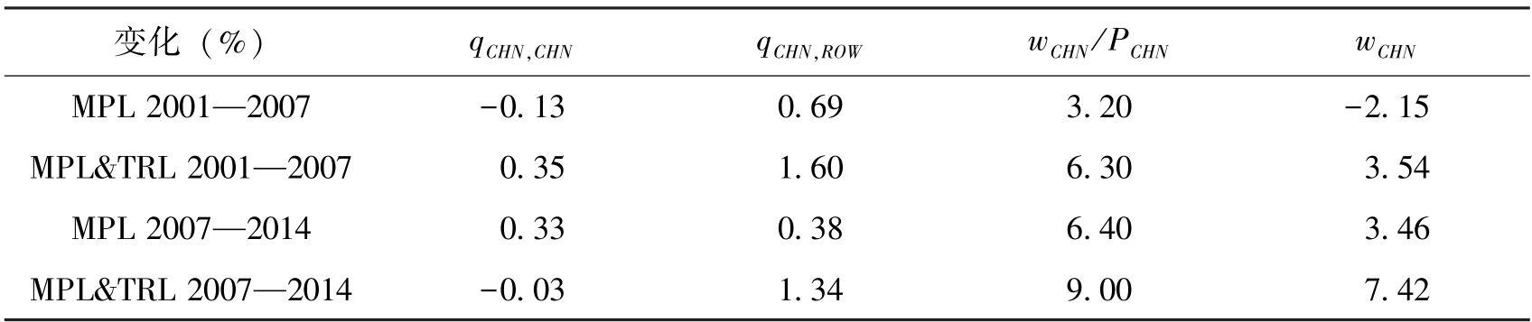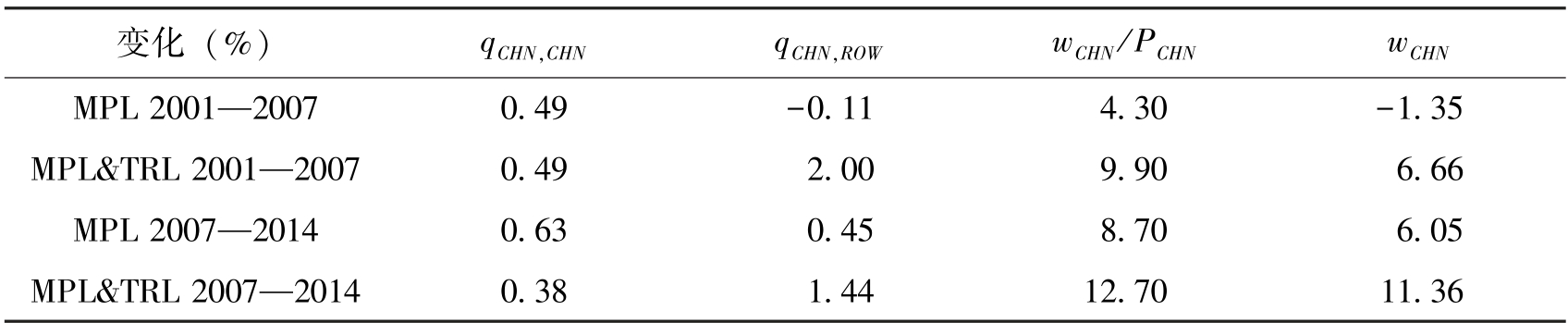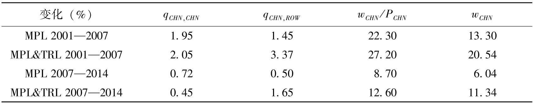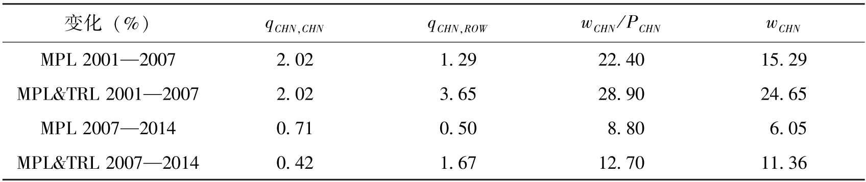 注:MPL 2001—2007 是指保持其他参数在2007 年水平,把γil 调整到2001 年水平;MPL&TRL 2001—2007 是指保持其他参数在2007 年水平,把(γil, τln)调整到2001 年水平;2007—2014 年含义类似。表7 同。