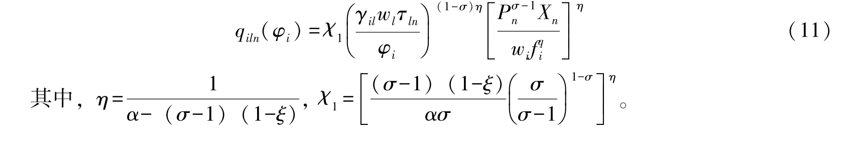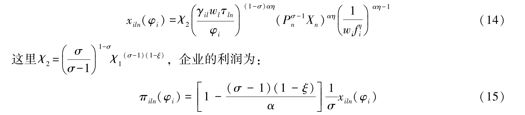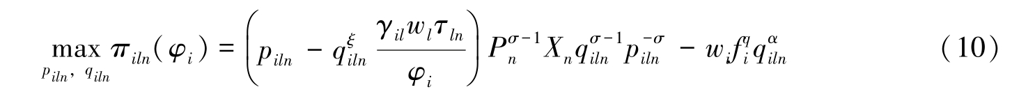 。 α≥0 表明生产质量较高的产品需要支付更高的固定成本。因此,给定企业在l 国生产,生产率为φi,并且出口到n 国,则企业最优化问题为:
