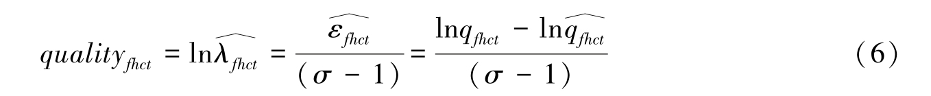 这里χct=lnEct-lnPct,其中χct 为进口国—时间层面的两维虚拟变量,可以控制如国家间地理距离、文化制度差异等随出口目的国变化的量,还有一国的汇率制度和贸易政策等随时间变化的量;此外,本文还控制了同时随时间和出口目的国变化的量,如一国的GDP 等;lnpfhtc 为企业出口产品的价格; εfhtc= (σ-1)lnλfhtc 为包含产品质量信息的残差项。本文的回归是在产品层面进行的,因此式(5)控制了产品层面的特征,如产品单位价值量和技术复杂度等,最终本文所需的产品质量可通过式(6)定义如下: