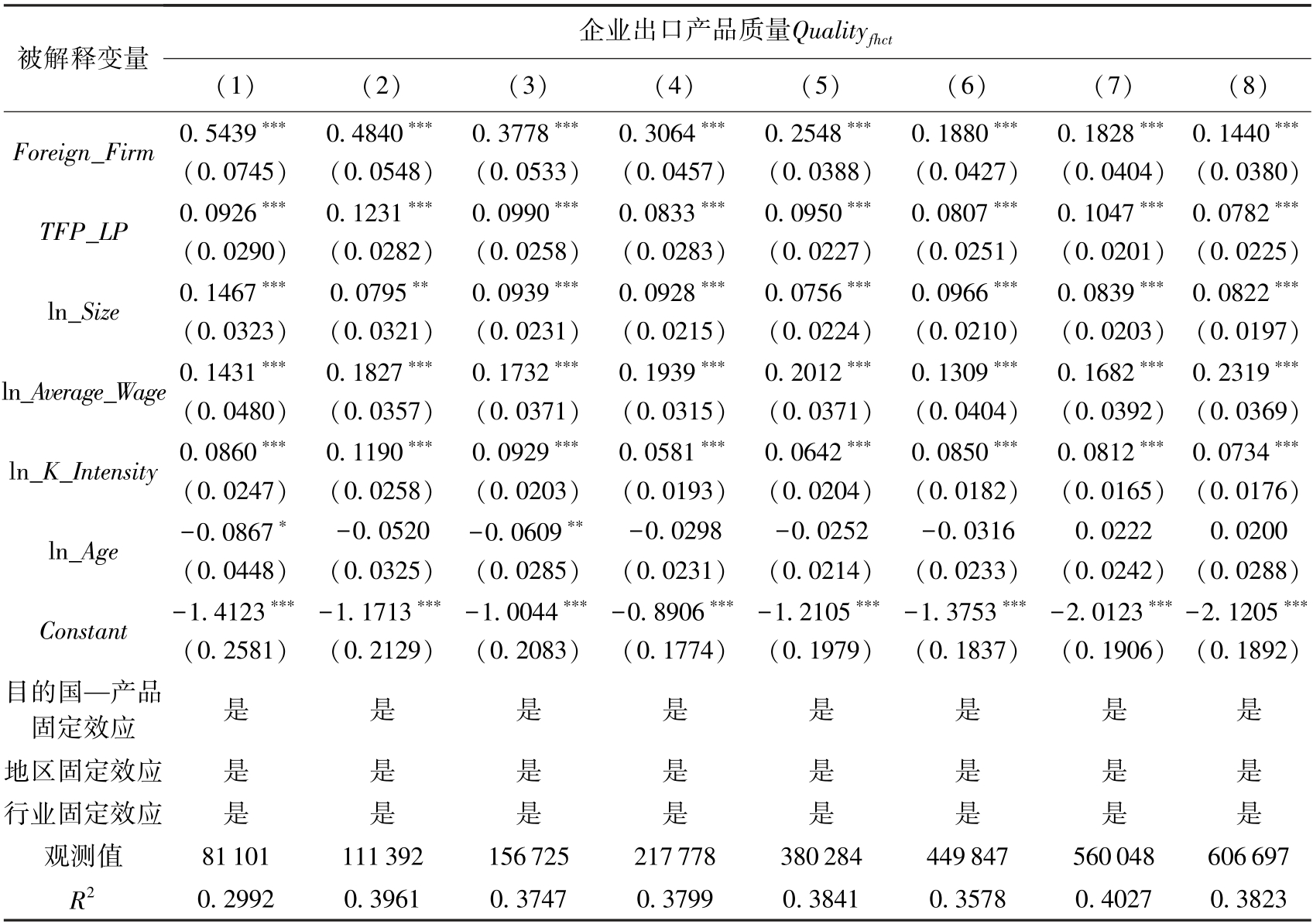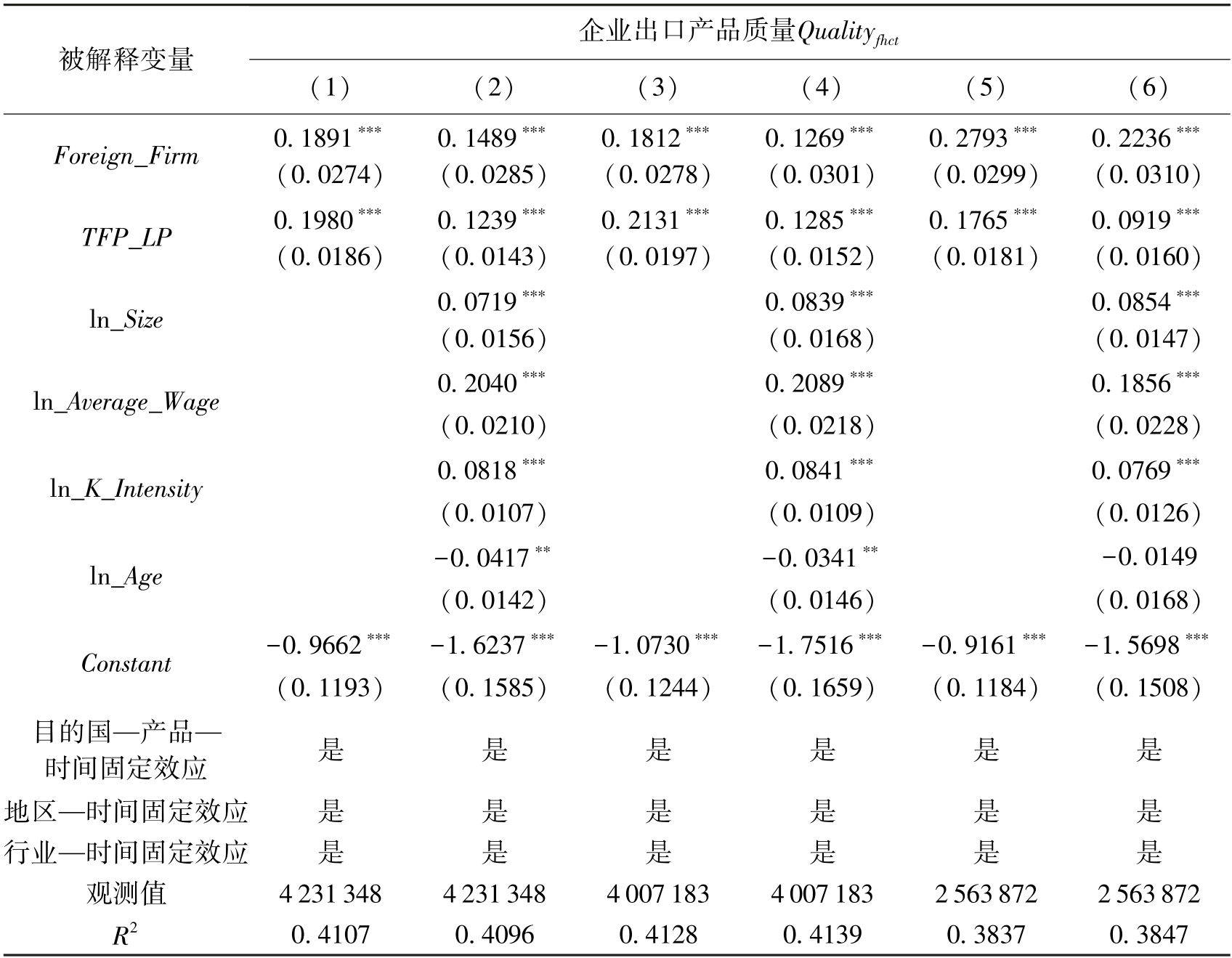 其中, f、 h、 c、 t、 d、 j 分别代表企业、产品、出口目的国、年份、地区和行业。Qualityfhct 为被解释变量,表示f 企业t 年出口到c 国h 产品的质量。 Foreign_Firmft 是企业所有制的虚拟变量,为核心解释变量, Foreign_Firmft 取“1” 表示外资企业,取“0” 表示内资企业。①本文使用两种方法对企业所有制进行界定:第一,企业登记注册类型。根据中国工业企业数据库中的记载,本文将外资企业定义为外商独资企业、中外合资企业和中国港澳台地区投资企业;将内资企业定义为国有企业、民营企业和集体企业。第二,外国和中国港澳台商资本金占比。根据《中华人民共和国中外合资经营企业法》,外国及中国港澳台地区资本金占实收资本比重超过25%的企业可认定为外资企业,否则为内资企业。本文在基准回归中采用第一种方式划分企业类型。 TFPft 为企业的全要素生产率。本文主要使用三种方法进行测算:Levinsohn-Petrin 方法(LP 方法),Olley-Pakes方法(OP 方法)和GMM 方法。基准回归中,本文采用LP 方法计算企业的全要素生产率。 X′ft 代表企业层面的特征变量。 φcht 表示出口目的国—产品—时间层面固定效应; φdt表示地区—时间层面固定效应; φjt 表示行业—时间层面固定效应。 εfhct 为随机误差项。本文将标准误聚类到地区—行业层面。