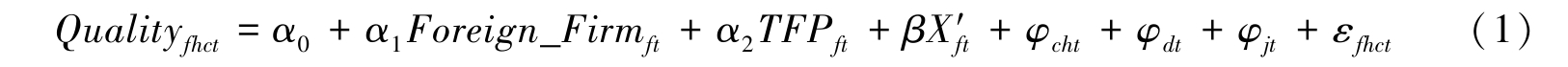 本文需要考察外资企业相对于内资企业在控制包括全要素生产率在内的一系列可观测因素后,是否还存在产品质量优势,故将基准回归模型设定如下: