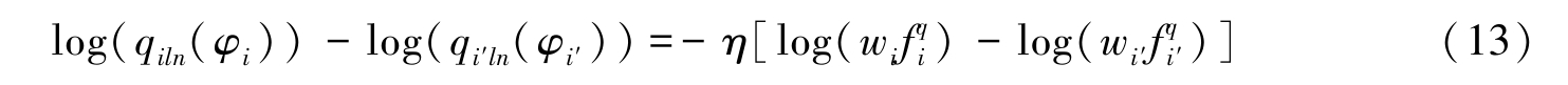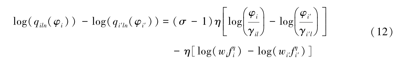 注意到,式(12)是本文理论模型与前文实证结果联系的关键,此式体现出产品质量的两个决定因素:企业全要素生产率和企业提升产品质量的成本。具体而言,式(12)右边第一项体现了全要素生产率对企业产品质量的决定作用。生产率较高的企业提升产品质量带来的回报更高,因此选择的质量水平也较高。这是Johnson (2012)等标准质量决定模型的基本结论。式(12)右边第二项体现了企业在提升质量固定成本方面的差异,这种差异使得外资企业在生产高质量产品方面具有额外优势。为了更清楚地说明这一点,本文令式(12)中的两个企业有相同的全要素生产率,即φi/γil=φi′/γi′l,那么式(12)可变为:
