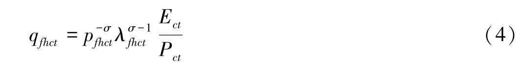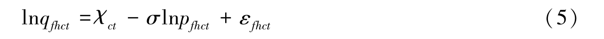其中, pfhct 和λfhct 表示f 企业在t 年对c 国出口的产品价格和产品质量; Ect 和Pct 分别表示t 年c 国消费者的总支出和产品价格指数; σ 为产品之间替代弹性,本文使用Broda 和Weinstein (2006)关于替代弹性的数据计算在每个HS 6 分位下产品的σ;接下来将式(4)两边取自然对数,整理后可得: