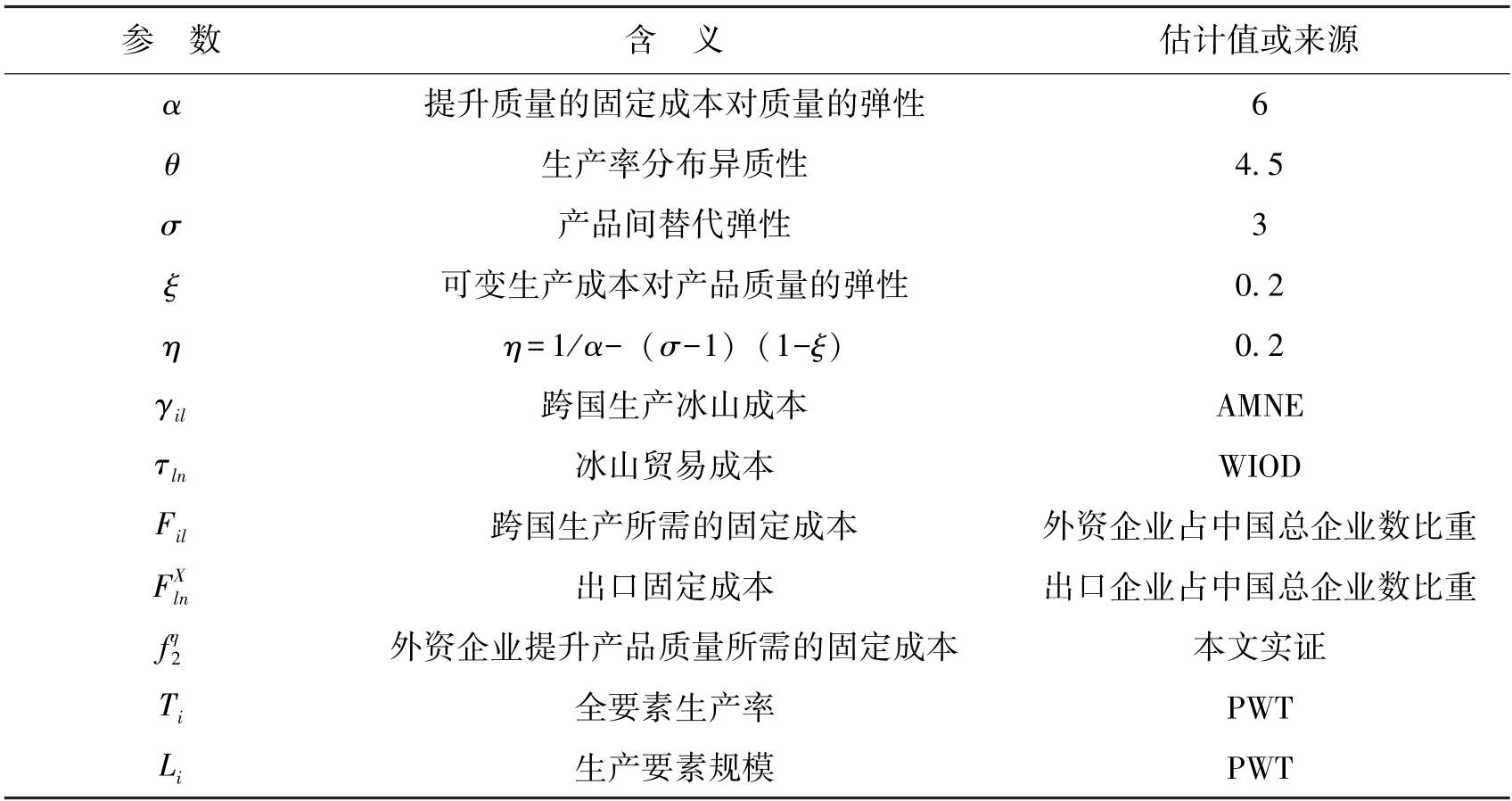 除上述核心机制外,本文模型的一般均衡效应使得外资企业的进入可以影响内资企业的产品质量选择。更具体地,外资企业进入东道国市场造成的竞争效应,会使得内资企业质量下降,这一点可以从式(11)中价格指数的下降得到,这一效应反映了外资企业的进入给东道国内资企业产品质量提升带来的负面影响。值得注意的是,现实中可能存在与这一效应相反的质量效应,即外资企业的进入可能通过知识溢出等渠道提升内资企业的产品质量。这一效应可以从表2 中外资企业相对于内资企业的出口产品质量优势逐年递减得到部分验证。但本文现有数据尚不足以识别外资企业对内资企业产品质量的溢出效应,因此本文模型尚不包含这一机制。从这个意义上讲,基于本文模型的量化分析,将低估外资企业对东道国的产品质量提升以及福利效应。