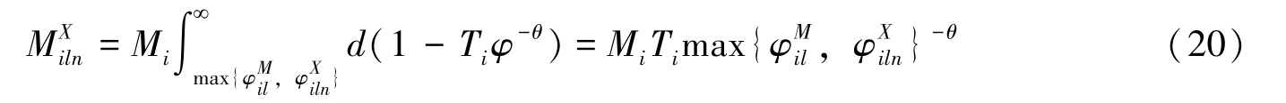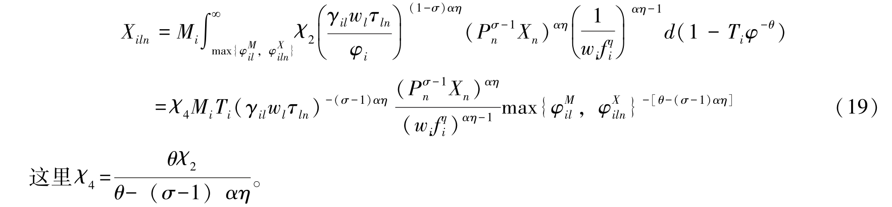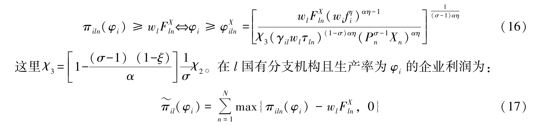 给定企业在l 国有分支机构,生产率为φi 的企业只有在满足以下条件时才会选择出口到n 国: