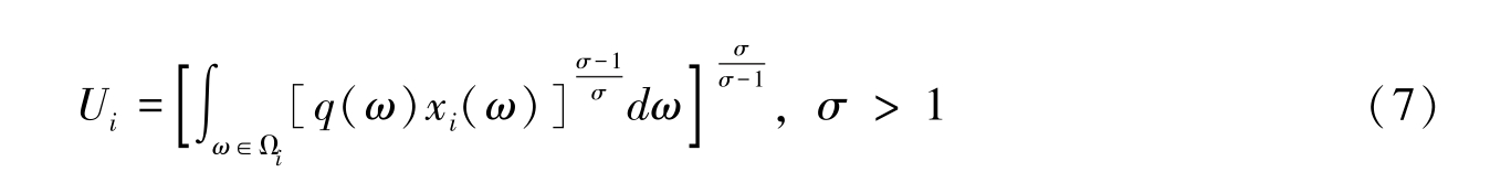 其中,Ωi 是在i 国可得到的所有产品种类的集合, q(ω)、 xi(ω)分别代表产品的质量和数量, σ>1 代表产品之间的替代弹性。