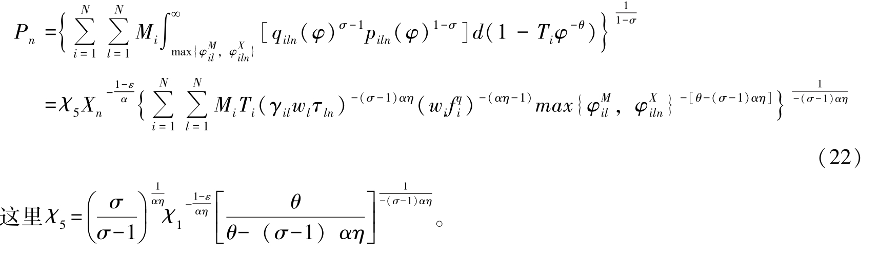 i 国的企业若在l 国生产,需要支付跨国生产的冰山成本γil≥1(γii=1),以及跨国生产的固定成本Fil,产出皆为可贸易品。从l 国出口n 国需要支付冰山贸易成本τln≥1(τll=1),还需要支付贸易过程中的固定成本FXln。总结起来, i 国的企业在l 国生产质量为q 的产品所需要的单位成本为: