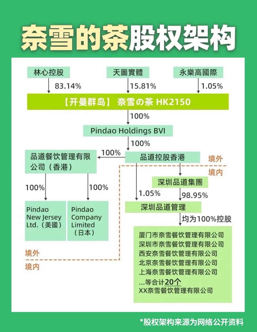 第一步:创始人于开曼群岛构建了“Nayuki Holdings Limited 奈雪的茶控股有限公司”,将其作为上市主体,该上市主体进而全资掌控在英属维尔京群岛注册设立的“Pindao Holdings BVI”。