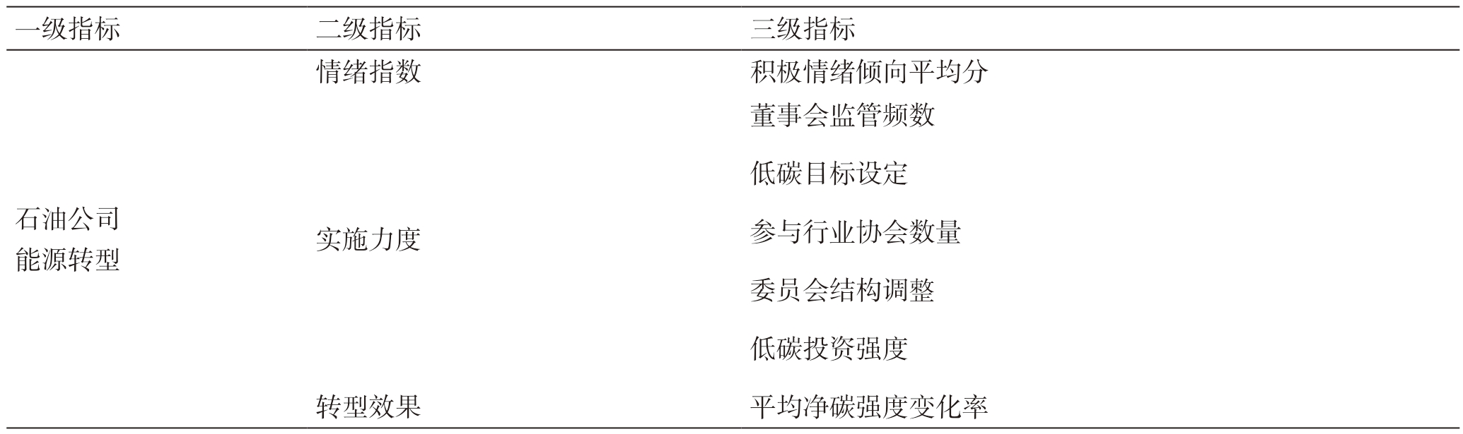 基于上述参考及指标体系构建原则,本节分别从情绪指数、实施力度和转型效果3 个维度构建国际石油公司应对气候变化的评价指标体系。