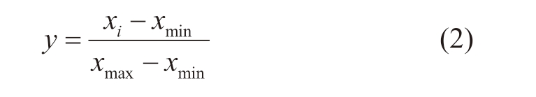 其中,xi为原始数据;y为标准化的数据;xmax为标准化过程中所选指标的最大值;xmin为标准化过程中所选指标的最小值。