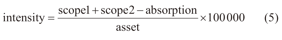 式中,intensity为净碳强度;scope1为企业温室气体直接排放数据;scope2为温室气体间接排放数据;absorption为企业碳复吸数据,单位均为百万吨二氧化碳;asset为各国际石油公司对应年总资产平均值,单位为百万美元。