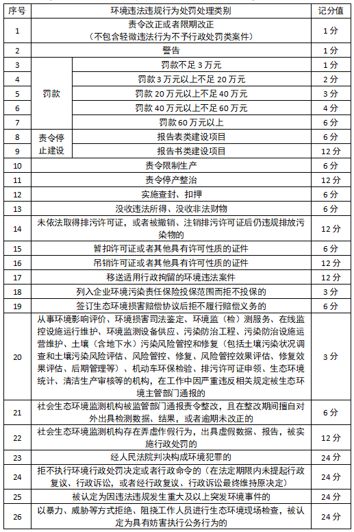 山东省企业环境违法违规行为记分标准