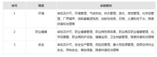 ESG时代下,EHS合规问题也会影响利益相关方要求的满足、产品竞争力及企业形象、经营的可持续性等。医药企业发生EHS合规问题(例如环境污染事故),将可能给企业带来民事、行政及刑事法律责任(一些情况下,特定的责任人员也可能被追究法律责任)。同时,企业还可能面临合同违约的风险、信用风险、商业伙伴关系维系等方面的挑战。EHS合规审核作为一种整体性排查企业EHS合规风险的工具,为越来越多的企业作为ESG合规管理提升的手段所采纳。医药企业进行EHS合规审核时,需要关注三个大的维度,分别是:E(环境Environment);H (职业健康Occupational Health)以及S(安全Safety)。在进行具体的EHS合规审核时,这三个大的维度下又会有很多细分的模板及维度。下表所列的审核模块供参考,具体需要视企业的行业和业务特征进行定制化调整。