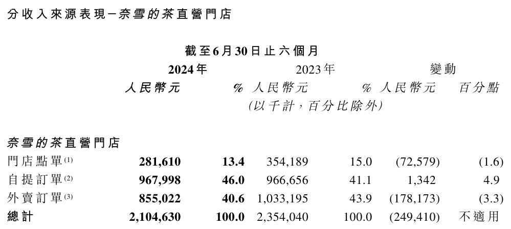 从财报数字来看,今年上半年,门店点单、外卖订单的收入分别为2.8亿元、8.6亿元,上年同期这两个数字分别为3.5亿元、10.3亿元。总的来看,奈雪自营门店自提订单的营收稳定,但是直营门店到店点单的营收占比下滑1.6个百分点,直营门店外卖订单营收占比下滑了3.3个百分点。