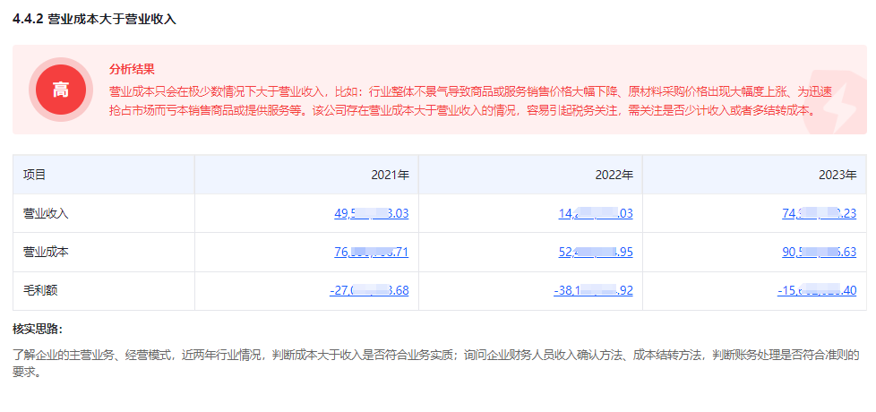 营业成本大于营业收入,即发生毛利亏损,是涉税风险监控的重点范围。但我们也不能一概而论,认为发生毛利亏损就有问题。我们仍然需认真分析原因,及时查找可能存在的涉税风险。排查是否由于市场环境因素导致,并准备好账簿、凭证、发票等相关证明资料,以备税局检查。