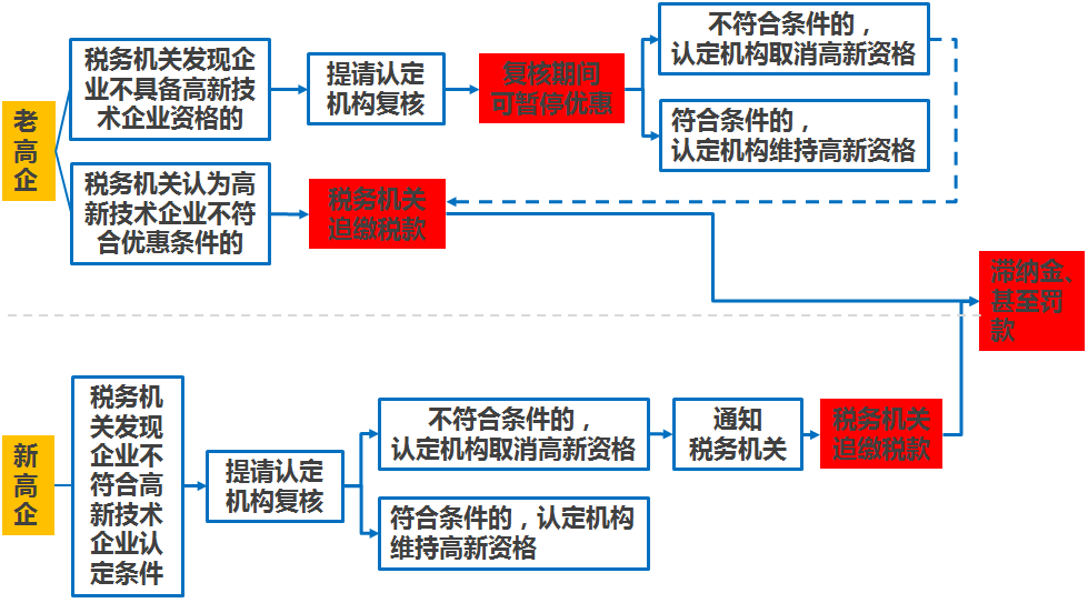 根据老认定办法及指引,税务机关在执行税收优惠政策过程中,如发现企业不具备高新技术企业资格的,并无权力直接取消企业的高新资格,而应提请认定机构复核,在复核期间可暂停企业享受减免税优惠。同时,根据国税函〔2009〕203号,当税务机关发现高新技术企业不符合优惠条件时,可以在不取消其高新技术企业资格的情况下,追缴高新技术企业已减免的企业所得税税款。