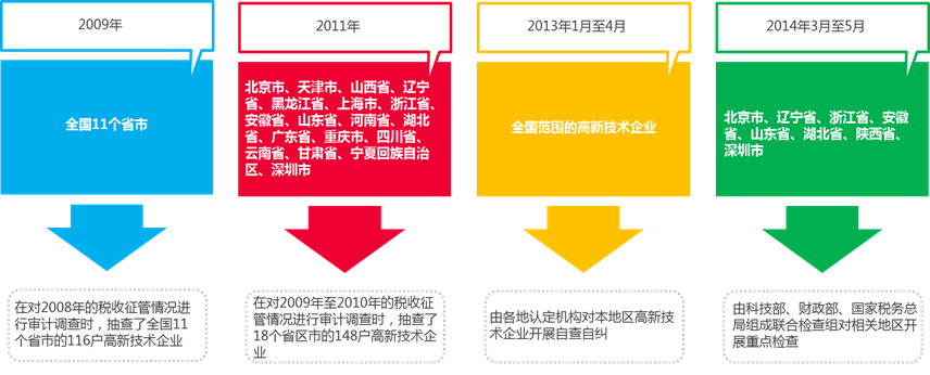 2008年以来,主管机关所开展的较大范围的高新技术企业检查如下图所示: