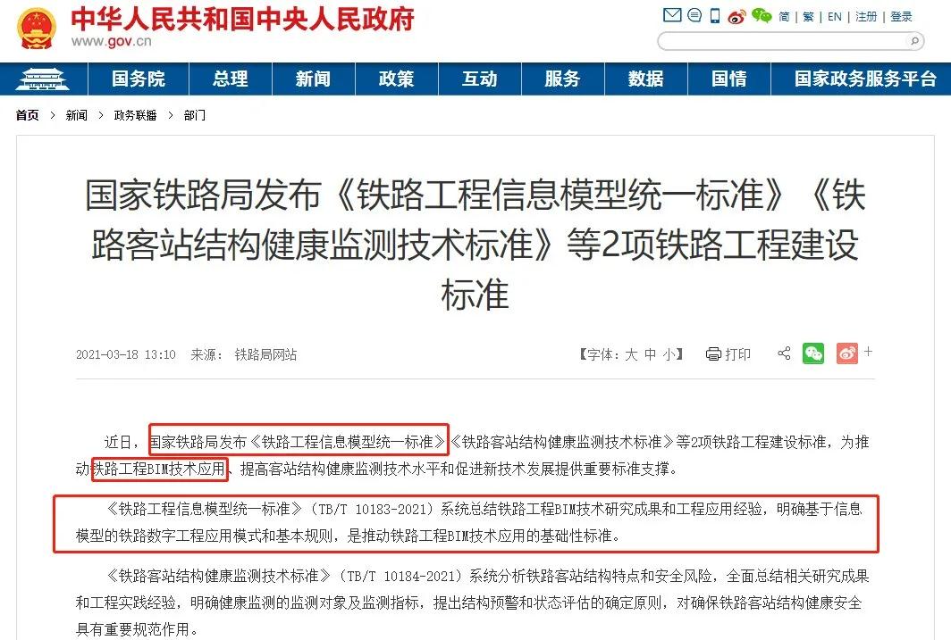 我国首部铁路行业BIM标准《铁路工程信息模型统一标准》(TB/T 10183-2021)由国家铁路局发布,将于今年6月1日起实施。据悉,该标准由天津港保税区企业中国铁路设计集团有限公司(以下简称:中国铁设)主编,多家铁路行业设计单位、高校等参编。该标准的编制将促进铁路工程信息模型技术发展,规范和引导信息模型技术在铁路工程全生命周期的应用。