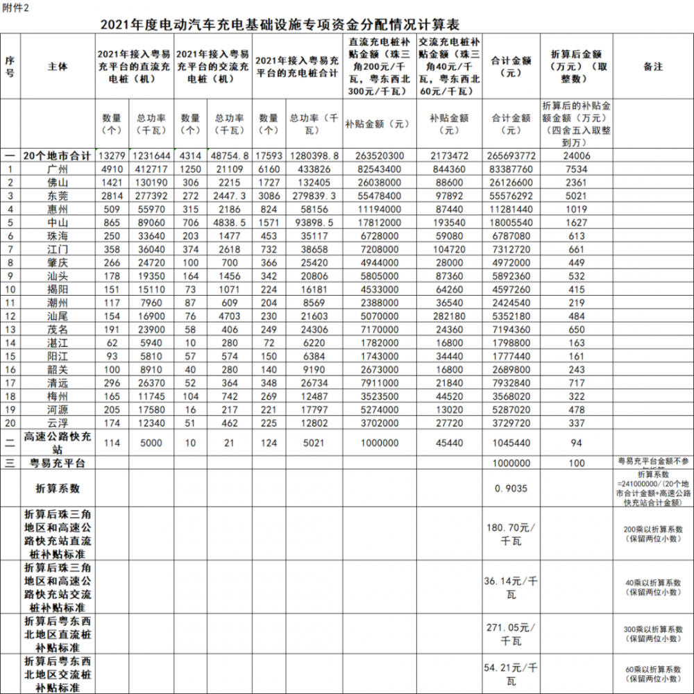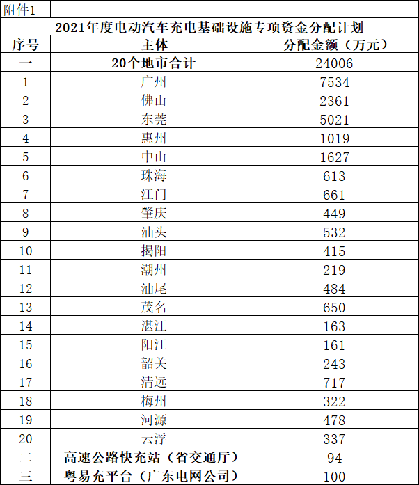 广东省能源局关于2021年度电动汽车充电基础设施专项资金分配计划的公示